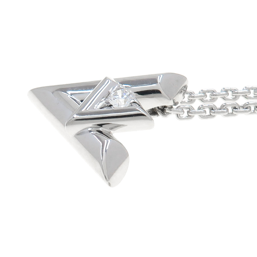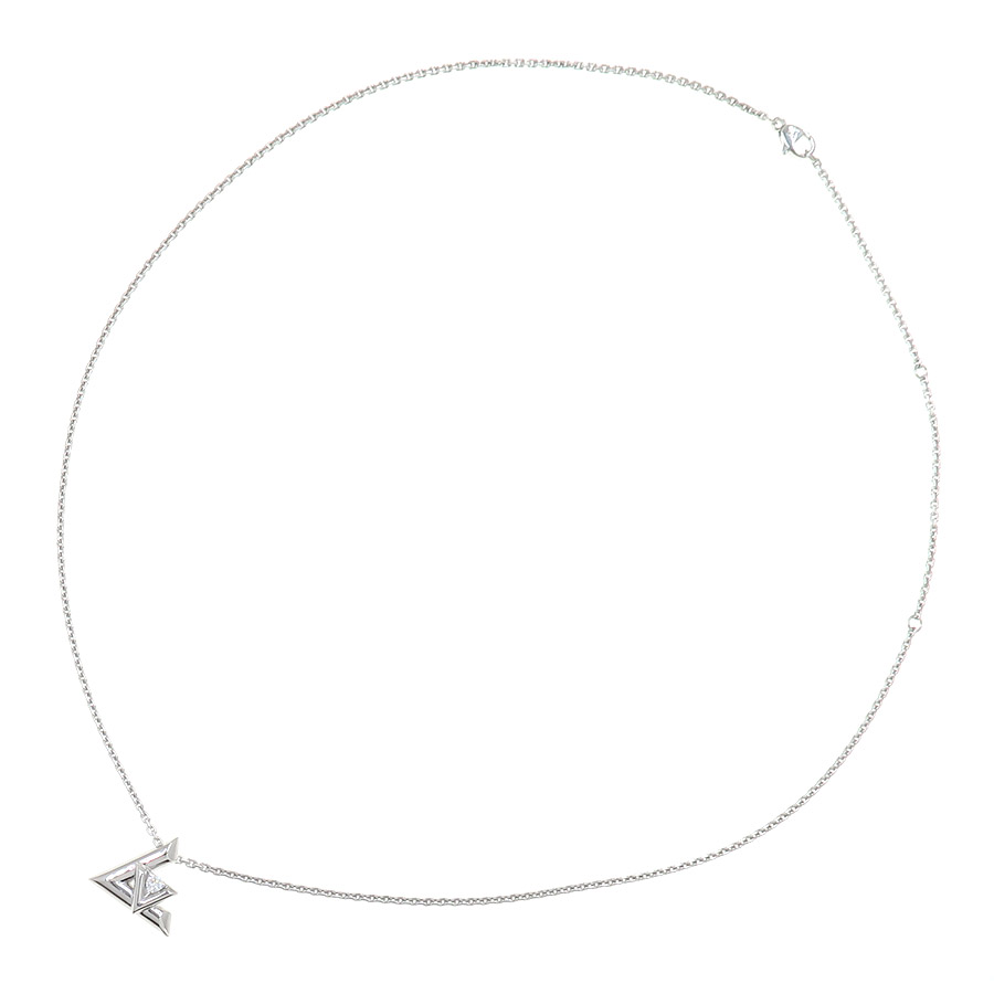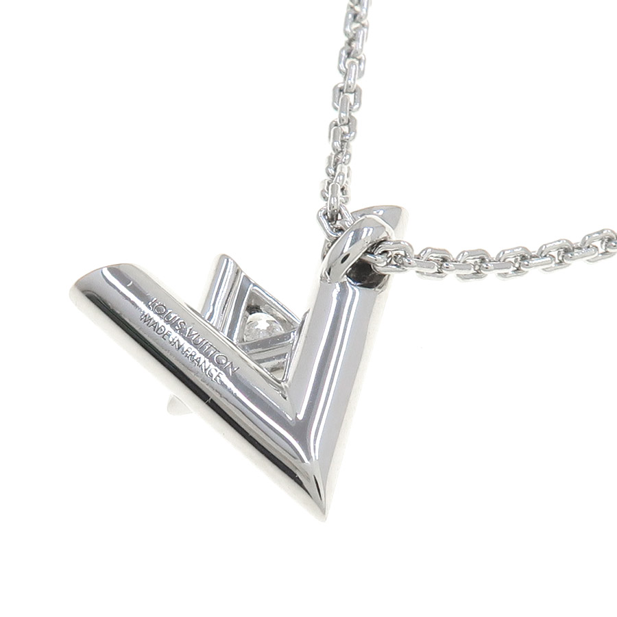 ルイヴィトンより、LVヴォルトワンダイヤネックレス/GMのご紹介です☆アイコニックなシグネチャーにオマージュを捧げるデザインをホワイトゴールドで仕立てた「LV ヴォルト コレクション」の『ペンダント LV ヴォルト ワン GM』♪小ぶりの「V」とやや大きめの「L」を組み合わせ、「V」モチーフにはブリリアントカットのダイヤモンドが存在感を放つネックレスとなっております◎トップ裏の刻印周りや、チェーンの引き輪の刻印周りなど、仕上げ(磨き)ができない部分に小キズが残っているためBランクとなっておりますが、その分お値段もお買い得となっております♪人気アイテムですので、気になった方は是非この機会をお見逃しなく☆