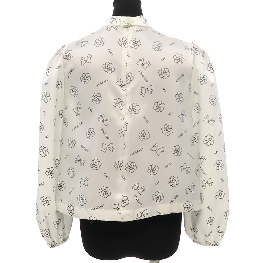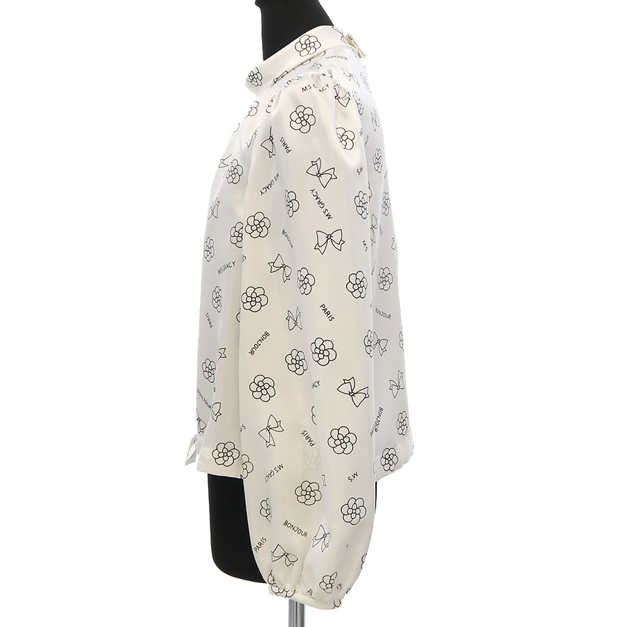 M′Sグレイシーから白地に花やリボンのブランドらしいモチーフの柄が全面にプリントされた可愛らしいお品物です。