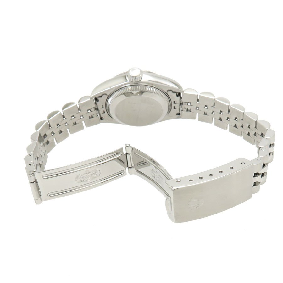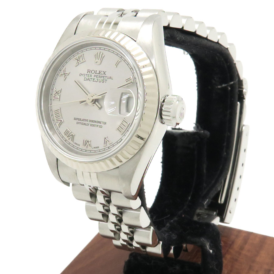Ref.79174 P番 2000年頃製 ロレックスのレディースデイトジャスト。ベゼル部分のみにホワイトゴールドを使用したモデルになります。グレーダイアルにローマンインデックスの組合せで幅広いシーンにもご使用いただけます。当社提携の時計修理工房にて外装の仕上げと機械点検を行っております。裏蓋に若干小傷がございます。
