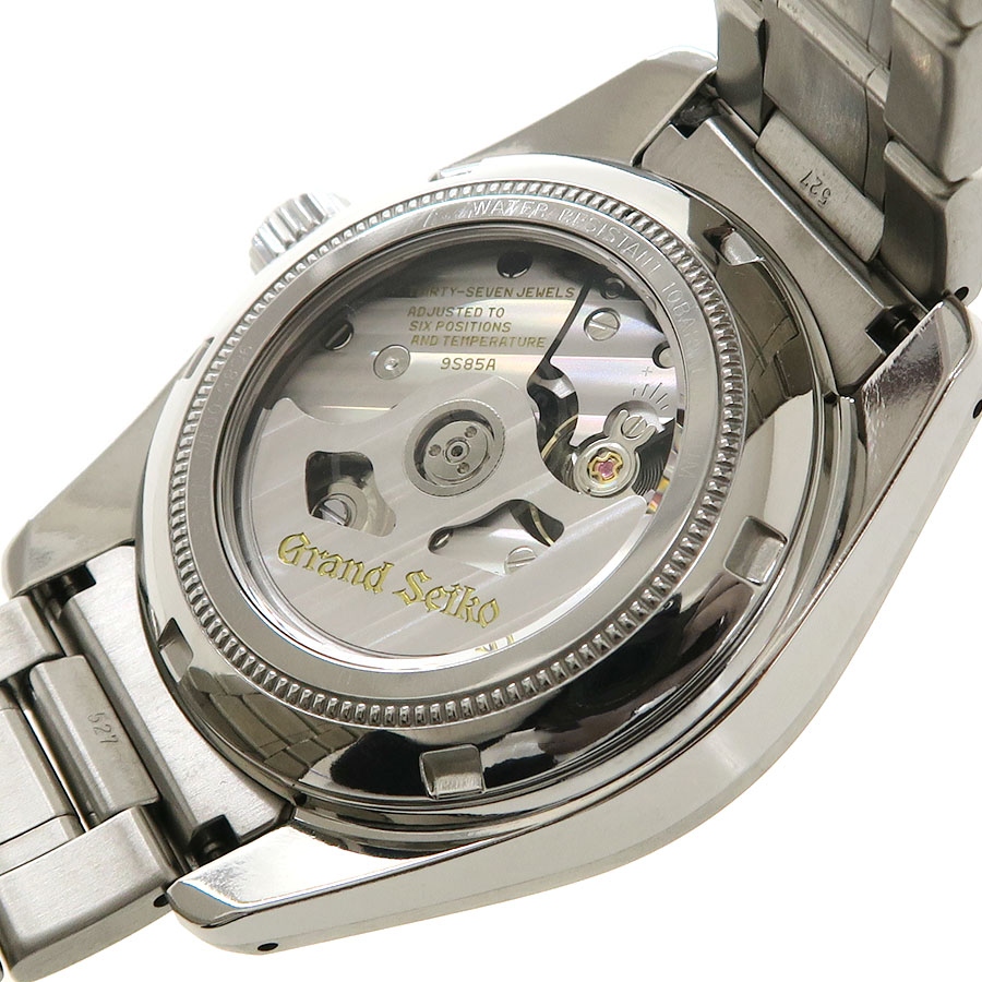 9S85キャリバーを搭載したマスターショップ限定モデルのグランドセイコーが入荷しました。機械式腕時計の精度を決める「てんぷ」の振動数が既存のモデルに比べ多い「キャリバー9S85」を搭載しています。見る角度によってカラーが変わるボルドー文字盤の3時位置に日付表示を配したデザインは年代を問わず、さらにフォーマルからカジュアルも問わずお使い頂けます。裏蓋はシースルー仕様になっていますのでセイコーは誇るキャリバー9S85を愛でる事が出来ます。
