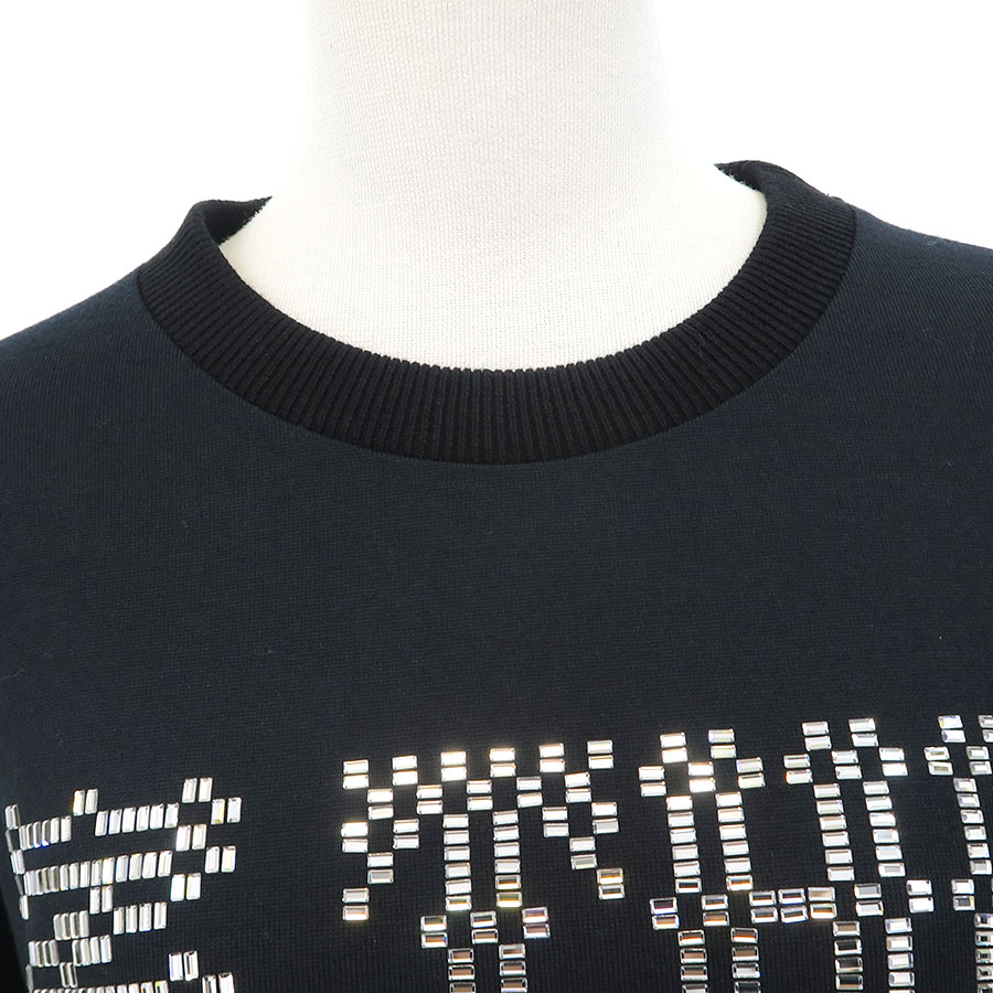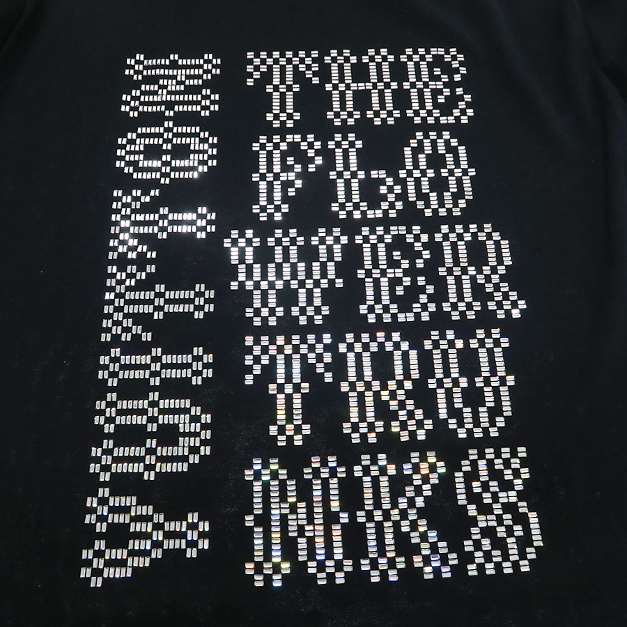 光に反射してキラキラと輝くストーンがラグジュアリーな華やかさを添えてくれます!生地は薄めで、やや透け感がございます。ストリートかつモードな雰囲気のあるデザインです!