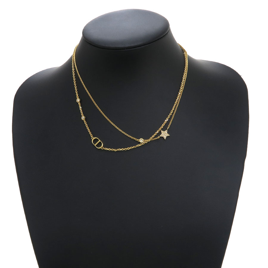2本のゴールドトーンメタルのチェーンの一方にCDシグネチャーをあしらった、クリスチャン・ディオールの『Petit CD (プチ CD)』ダブル ネックレスが入荷しました!☆もう一方のチェーンには、ホワイト クリスタルをパヴェ セッティングした、ムッシュ ディオールが愛したスターのシンボルと、控えめなホワイトのクリスタルを1つずつデザイン♪デイリーにお使い頂ける、タイムレスでエレガントな人気のネックレスです!