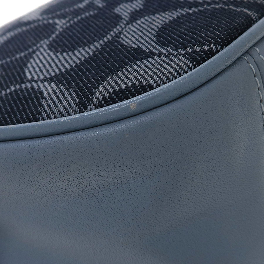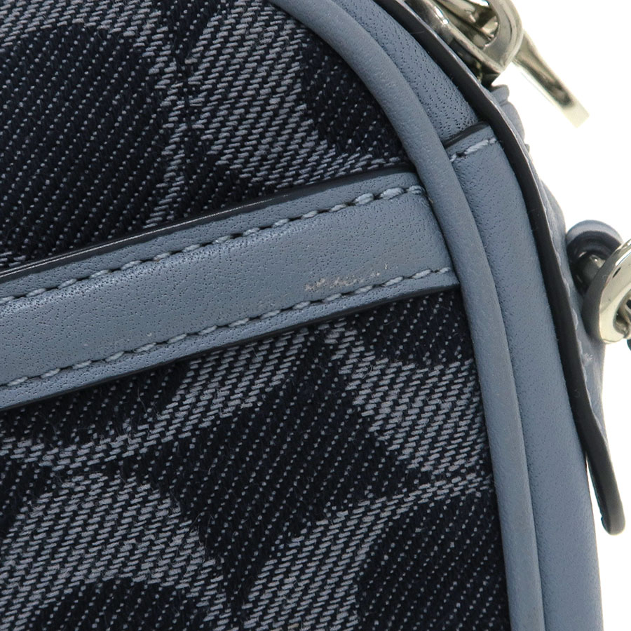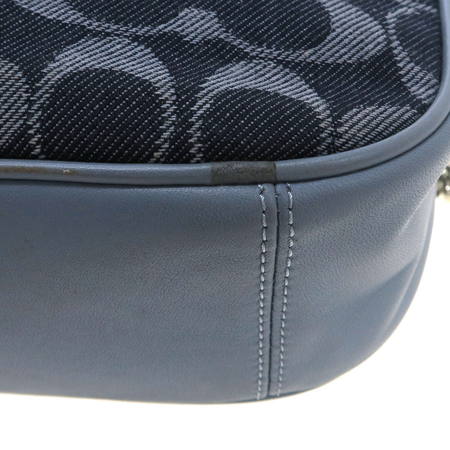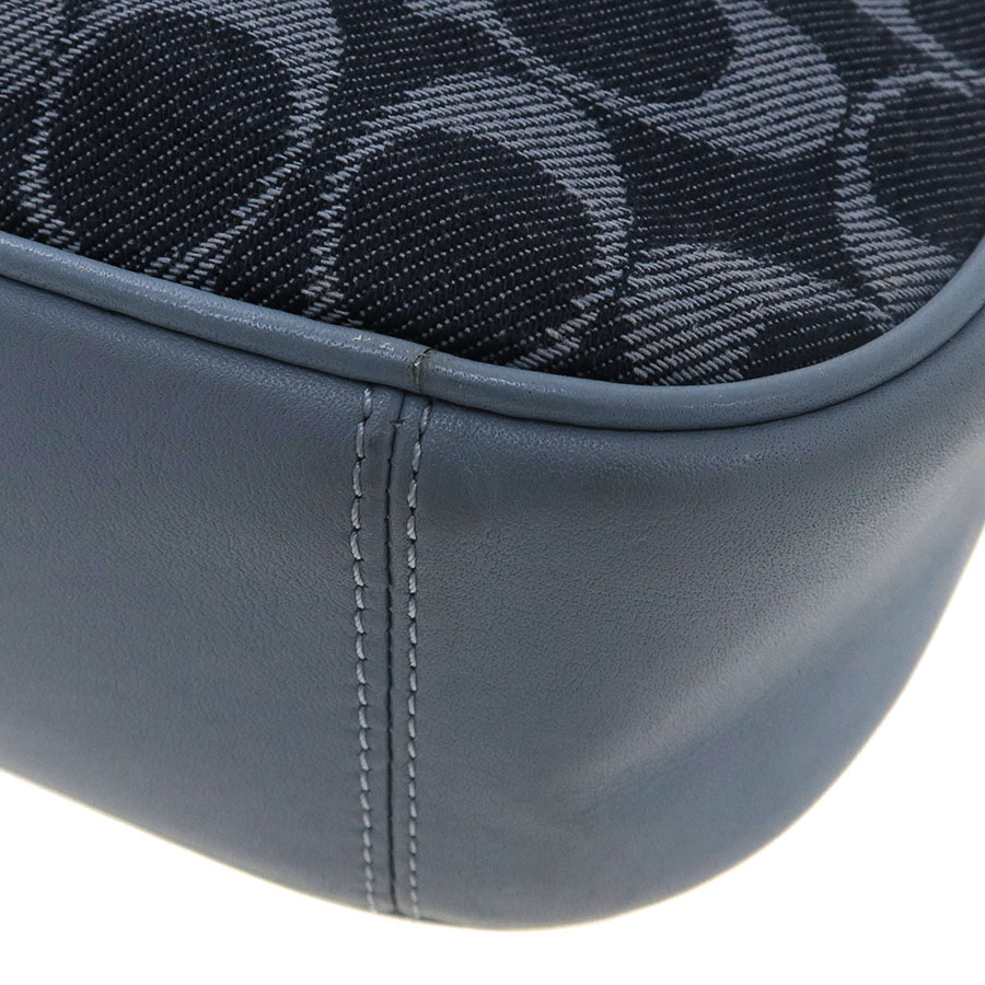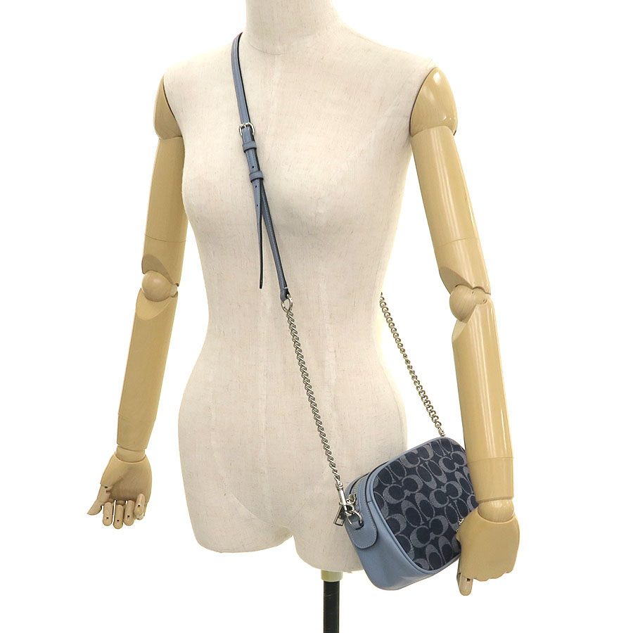 コーチのチェーンショルダーのご紹介です!前後がデニム地のシグネチャー柄。開閉はファスナー式で、中はポケット1つあり。背面にはポケット1つあり。ショルダーストラップは両端がチェーンフックになっていて、レザー部分はバックルで7段階長さ調整可。
