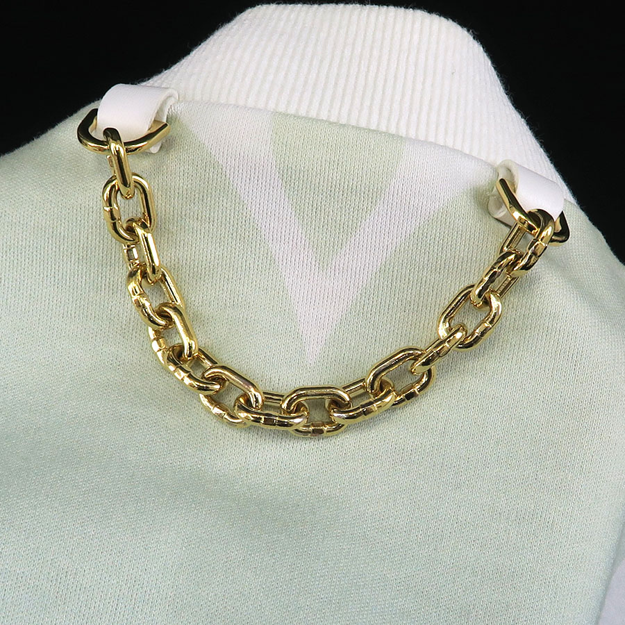 全体にコットン特有の起毛・ヨレ・シワ、後ろ右肩甲骨辺りに茶色い点汚れ、アームホール部分のゴムの黄ばみ、襟のくすみ汚れ、後ろのモノグラムフラワーの色褪せ、チェーン部分の小キズ・スレが見受けられる為Bランクでのご紹介です。