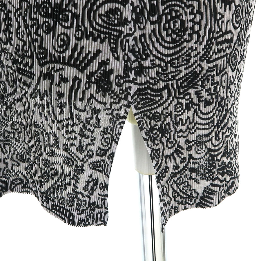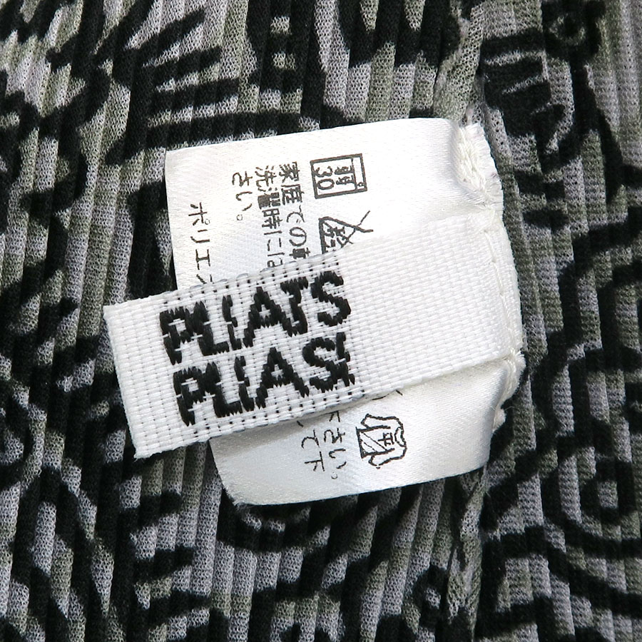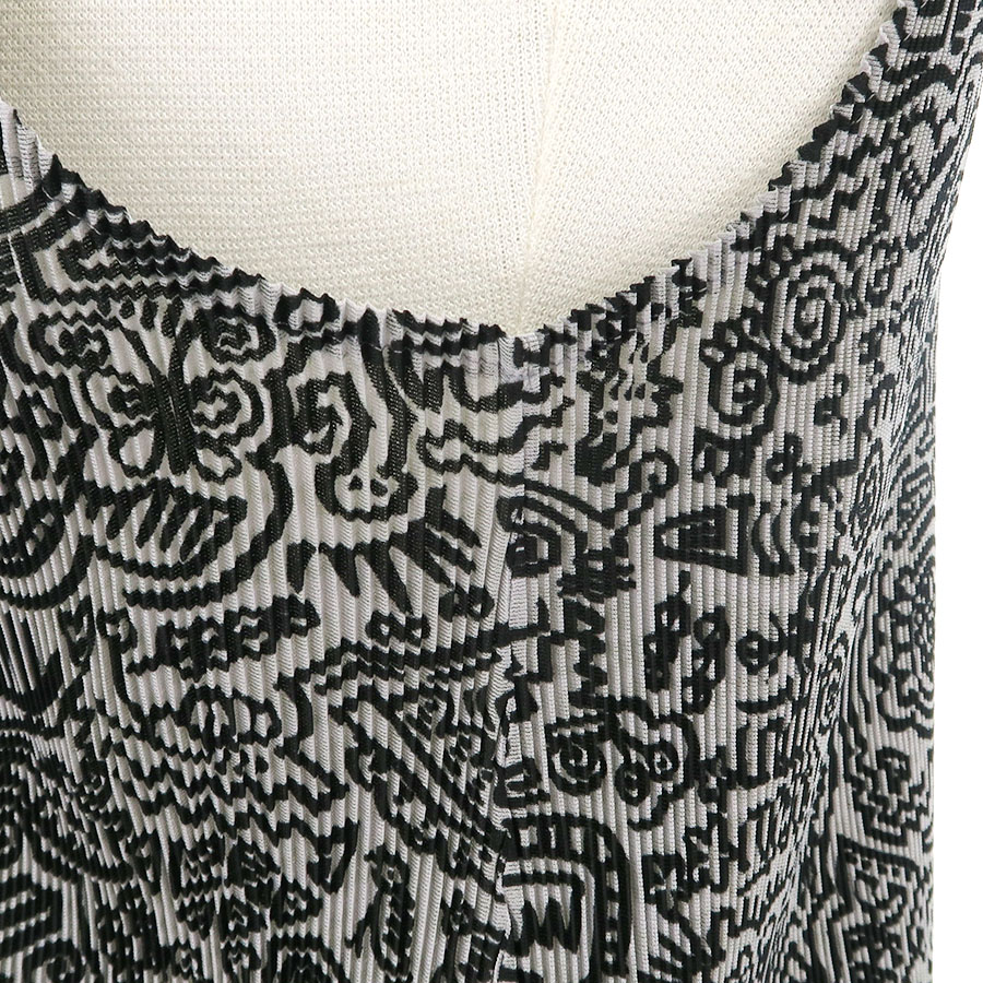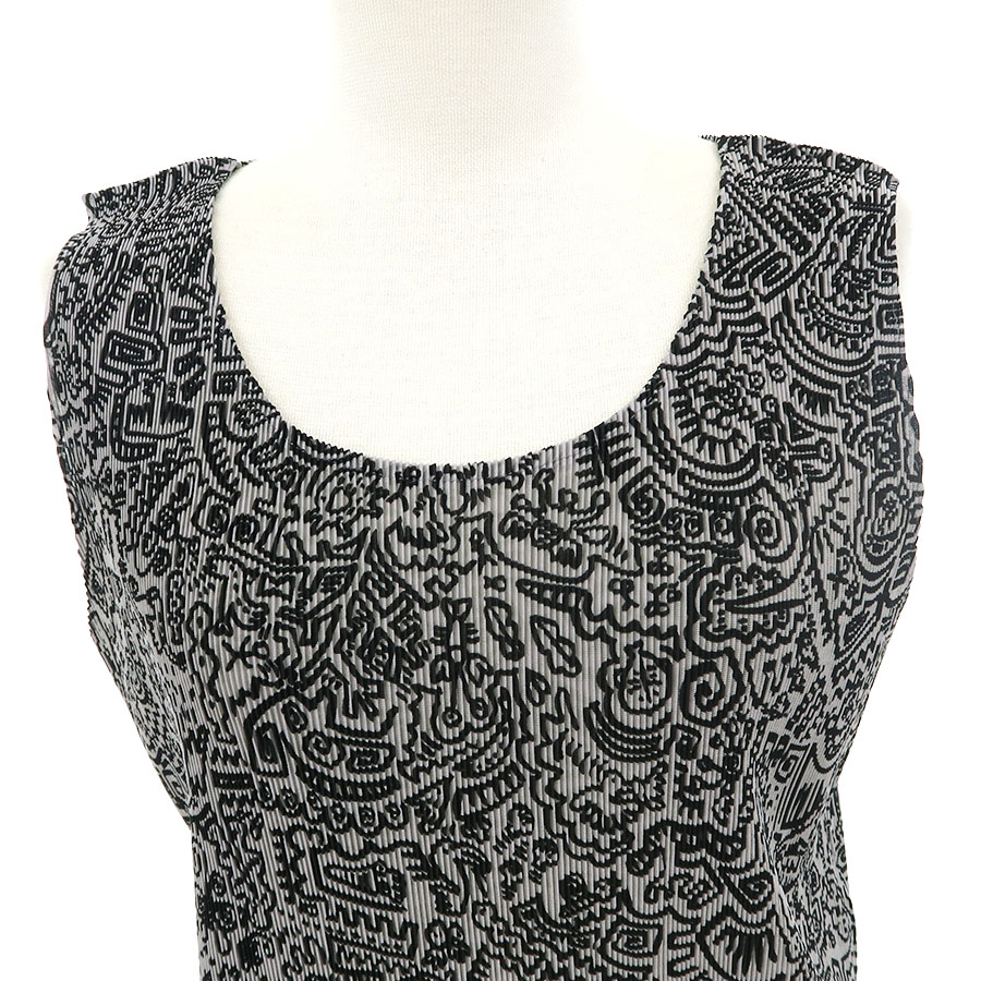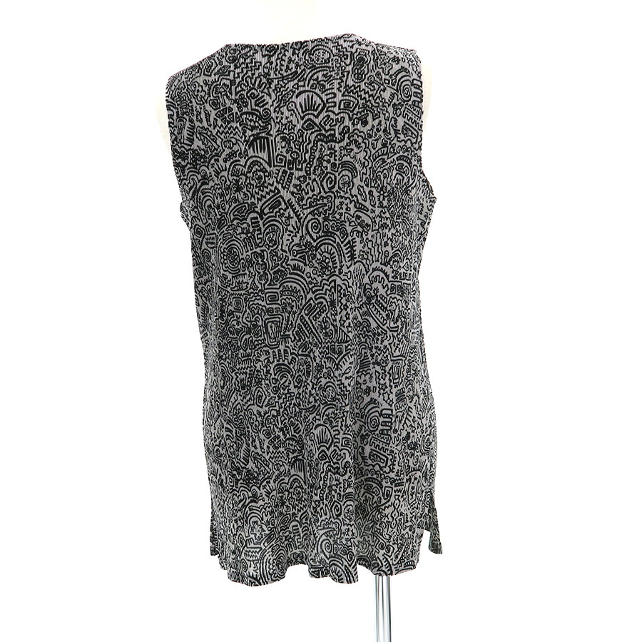 イッセイ・ミヤケプリーツプリーズからグレーのノースリーブトップスが入荷しました。グレー地に黒のプリントとプリーツ加工が施されたお品物です。