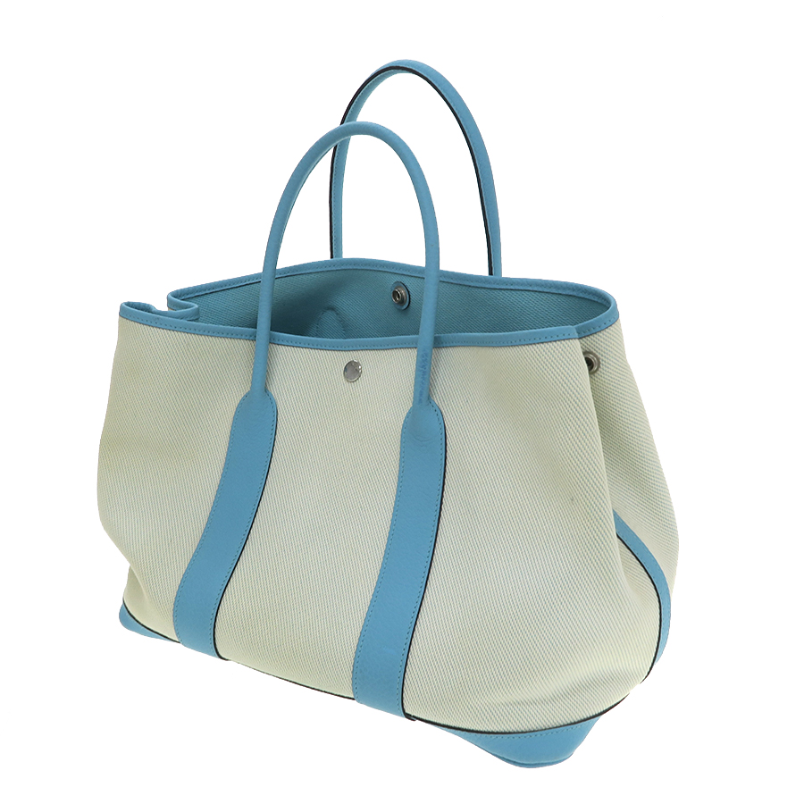 カジュアルテイストながら上品な雰囲気漂い爽やかな水色系のレザー、エルメスの定番人気トートバッグ『ガーデンパーティPM』が入荷しました。ブランドをアピールしすぎないシンプルなデザインで色んなスタイルに合わせ易く、どなたでも気軽にお使いいただける一品です♪間口はボタンタイプとなっており、簡単に開閉することができて、中身の出し入れも楽々です。状態はAランク。表面に薄汚れ、薄スレ、角スレ、型崩れなどございます。内側には小さな汚れがございます。使用感は少なく1つあると重宝するオススメ品です♪