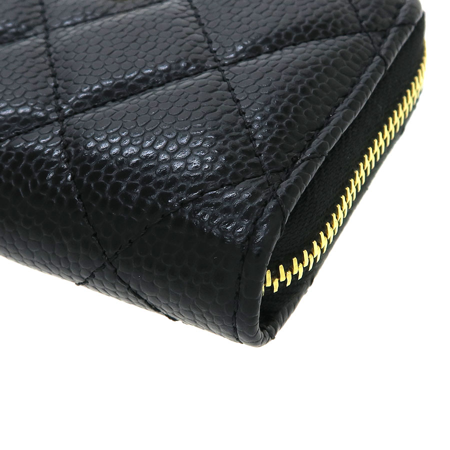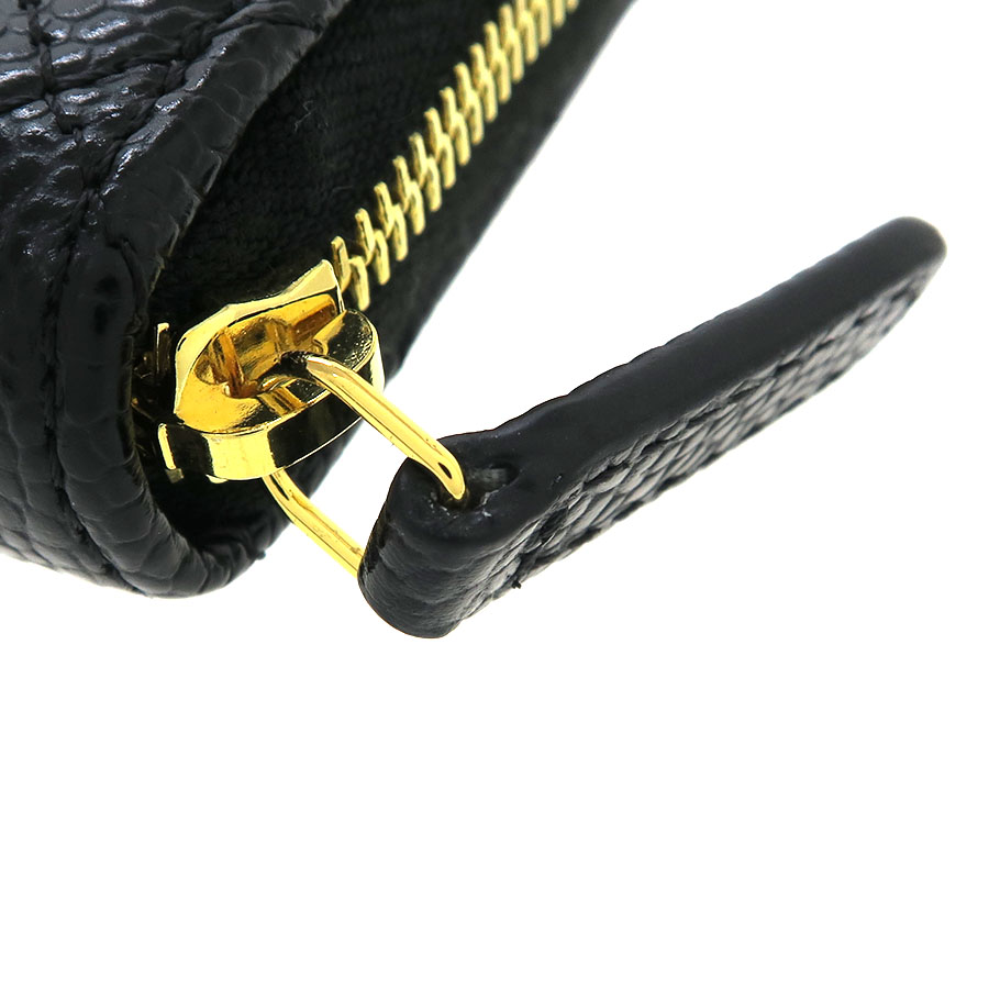 シャネル王道のキャビアスキン×マトラッセのコンパクトなコインケース『キャビア・マトラッセ・コインケース』が入荷いたしました☆ブラックカラーのキャビアスキンにゴールドの金具の組み合わせが大人かわいいコインケースです♪間口は中身の取り出しやすいラウンドファスナータイプで内側には3つの収納スペースがございます。手のひらサイズのお財布はトレンドのミニバッグとも相性抜群ですよ◎ 状態はAランクでの入荷になり、金具の小傷、間口のスレ、内側の生地スレがございます。 使用感及びダメージはかなり抑えられており大変オススメです!
