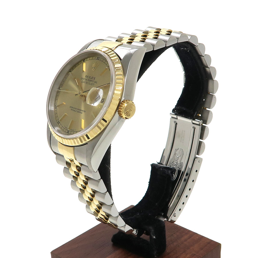 Ref.16233 W番 1994年頃製 旧型メンズ・デイトジャストが入荷致しました。本体はステンレススティール、ベゼルとブレスの一部でイエローゴールドを使用しています。文字盤は定番人気のシャンパンゴールドダイヤルとバーインデックスの組み合わせになります。