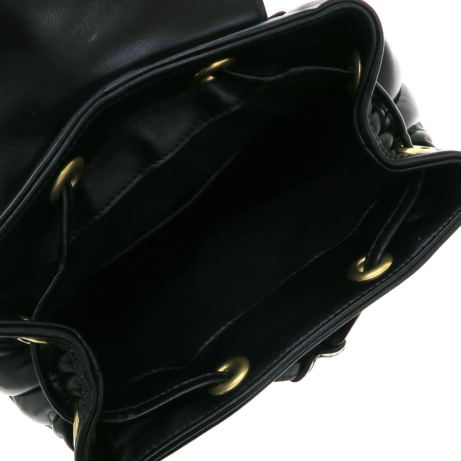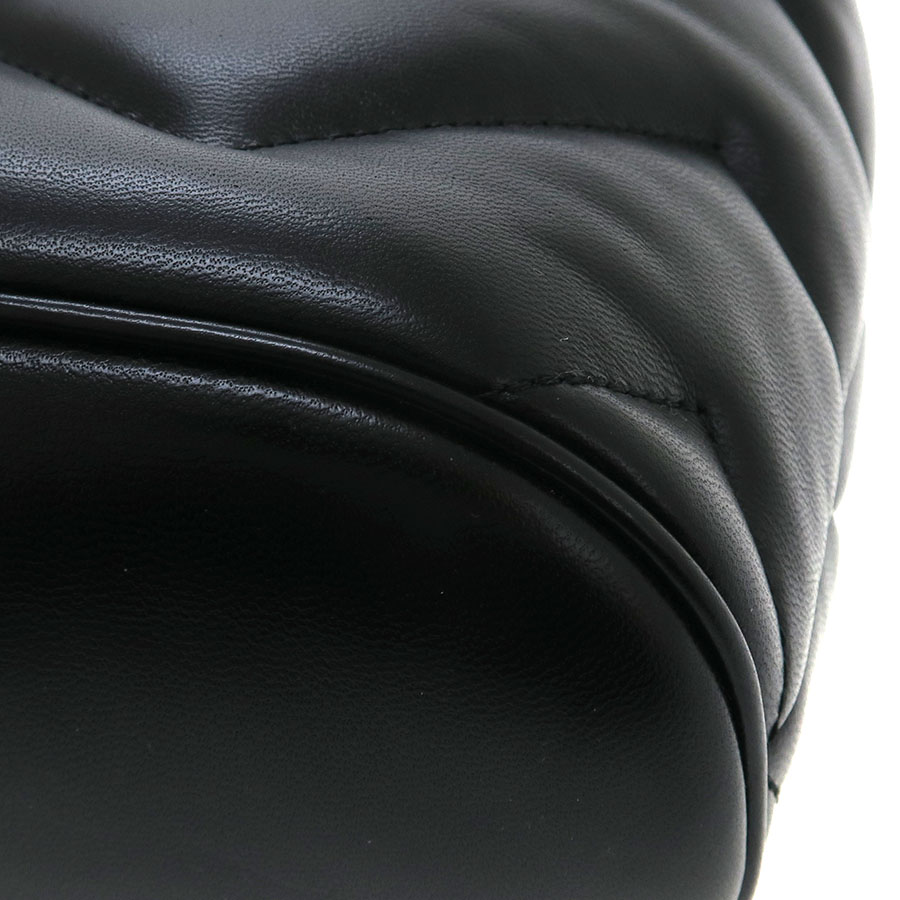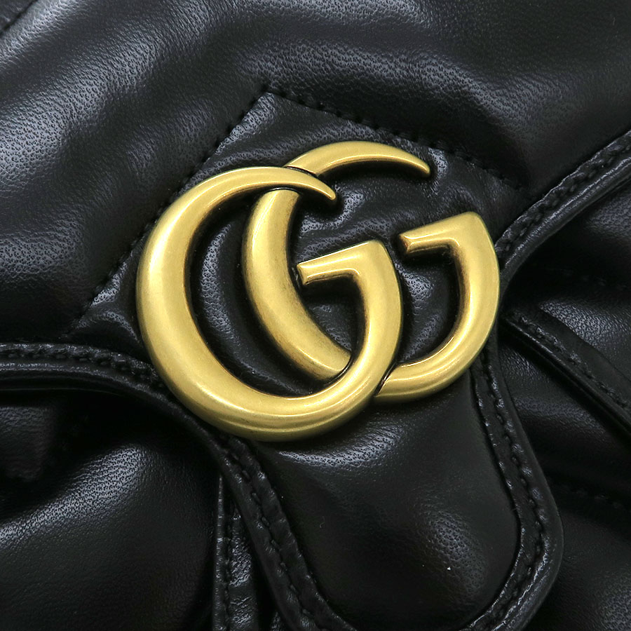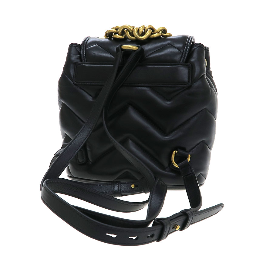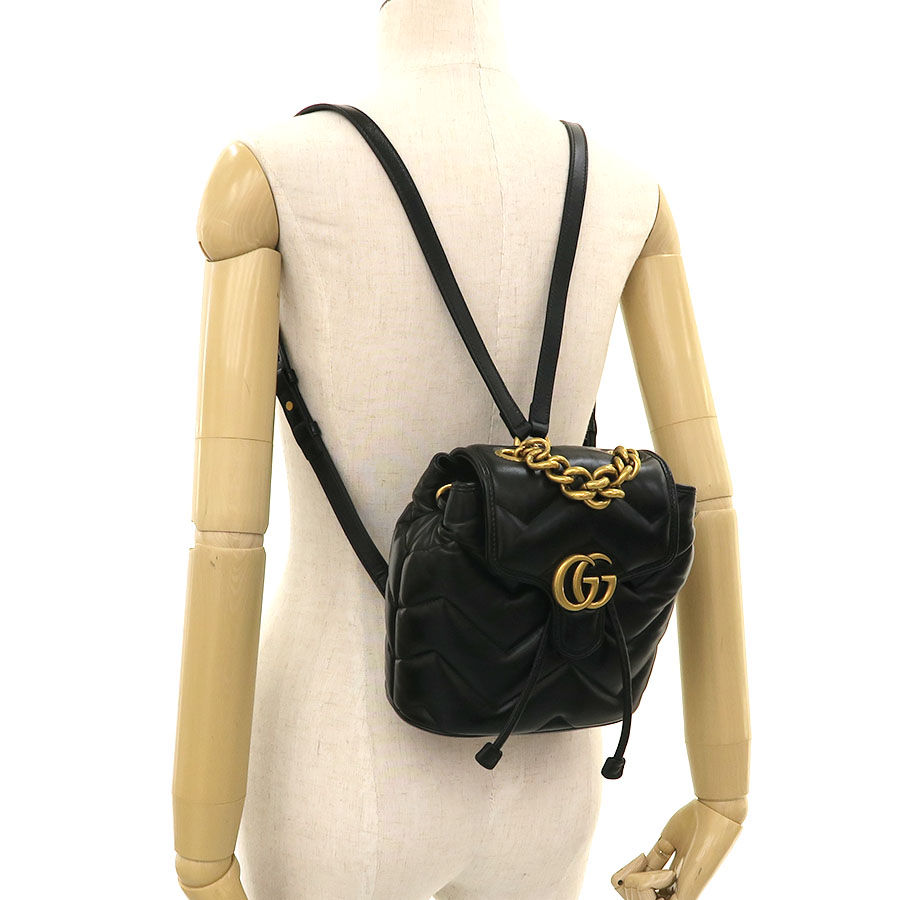 グッチ GGマーモント・バックパックのご紹介です。フラップにGGマーモント金具があり、ブラックカラーレザーのキルティング模様のミニサイズのモデルになります。間口は革紐で絞り込むタイプ。内部にはスリットポケットがあります。ハンドルはGPチェーンとなります。
