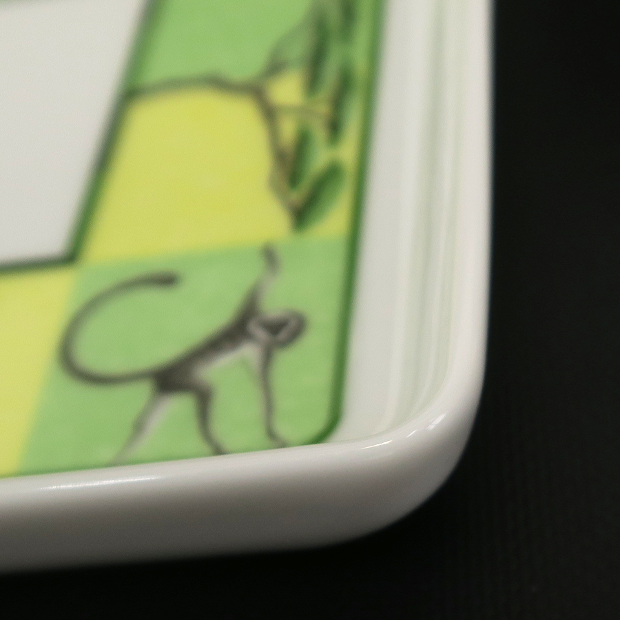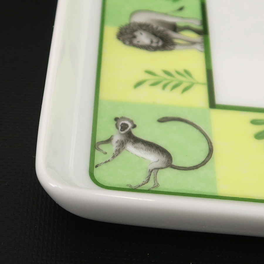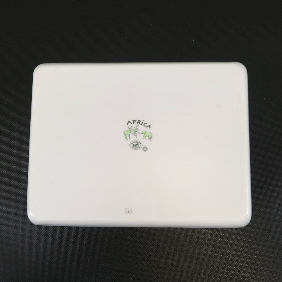 エルメスのアフリカ・ミニ スクエアプレートのご紹介です!白色ベースの陶器にアフリカに生息する動物が描かれています。裏面の真ん中にはロゴと動物の絵が入っています。