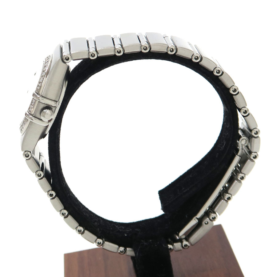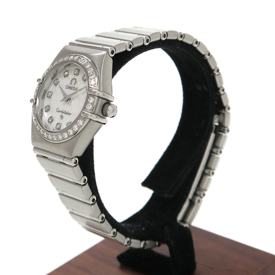 1952年より続くオメガの最高級ライン「コンステレーション」。その中でも華やかなコンステレーションミニが入荷しました。オメガマークがデザインされたホワイトシェル文字盤に12Pダイヤ、それを取り巻くベゼルにもダイヤモンドが配され貴女の手元を彩ります。当社提携の時計修理工房にて外装の仕上げと電池交換を行っております。
