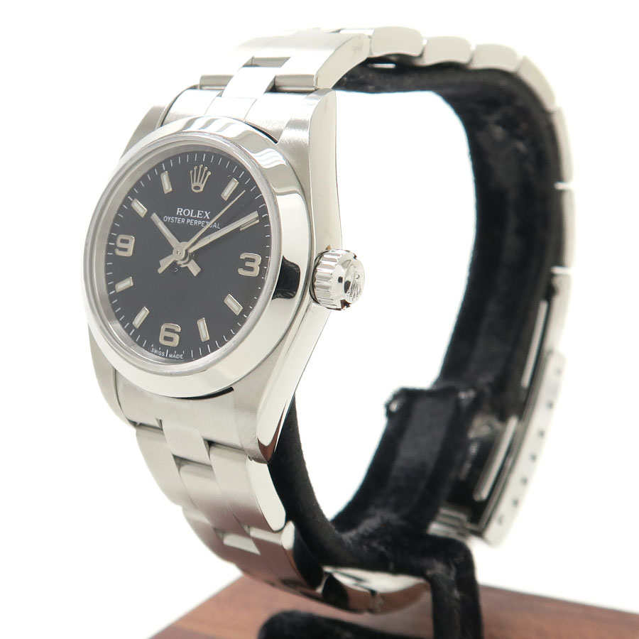 レディースモデルのオイスターパーペチュアルが入荷しました。文字盤は黒文字盤に3・6・9飛びアラビアインデックスになります。日付表示なしのシンプルデザインはシーンを問わずお使い頂ける1本です。