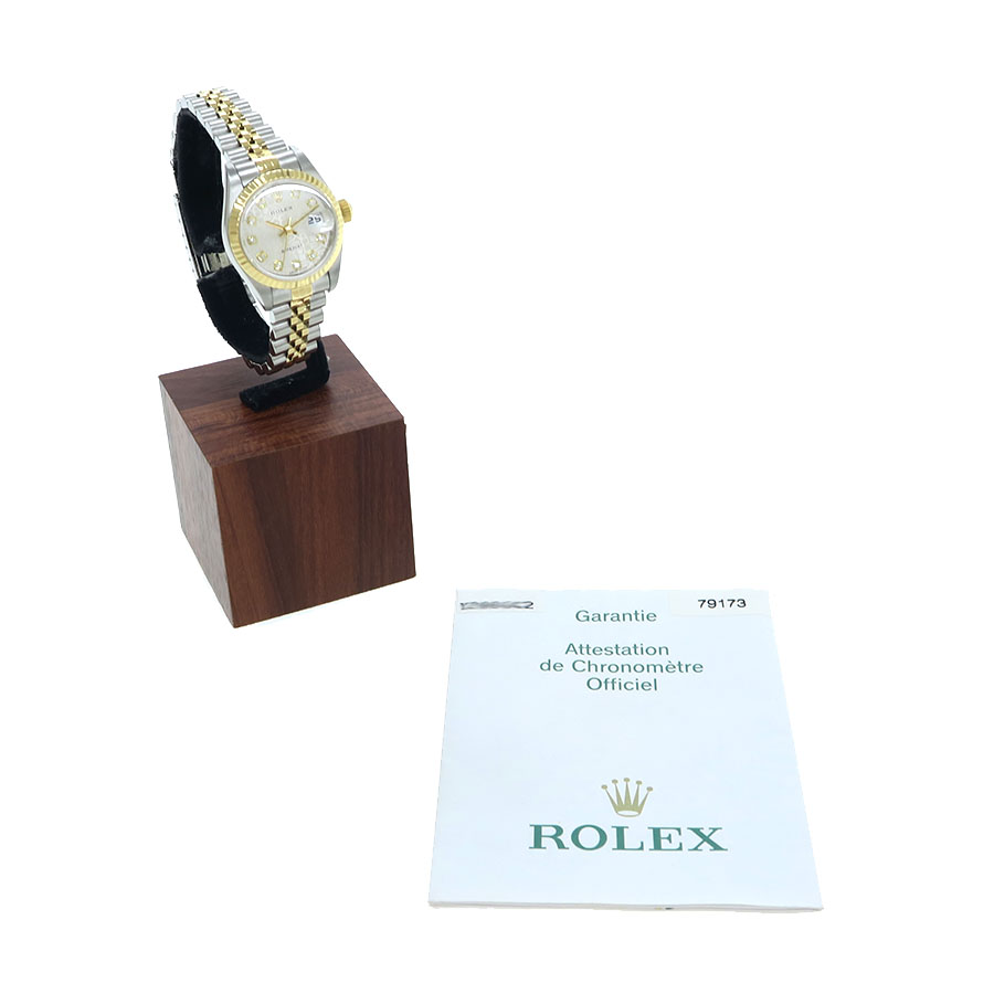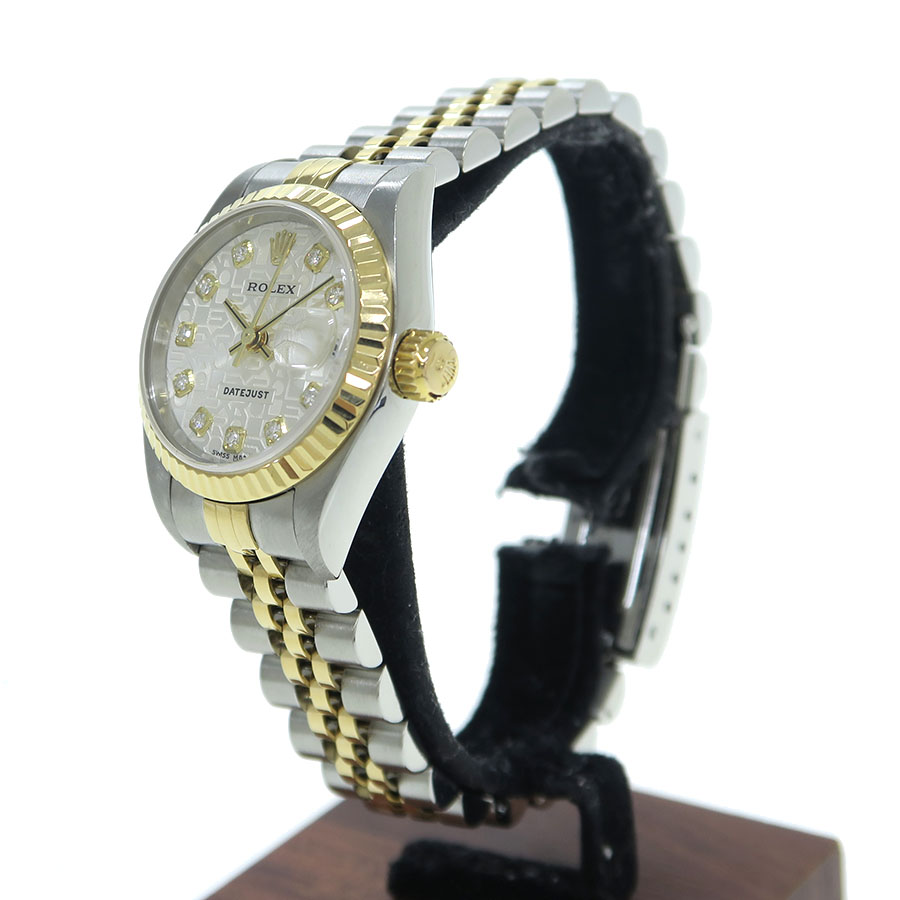Ref.79173G Y番 2002年頃製 ロレックスのステンレス+イエローゴールドのコンビレディース・デイトジャストが入荷しました。前型にはなりますが、ダイヤモンドインデックスは現行留めになっております。シルバーコンピューターダイアルで高級感もありながら普段使いしやすい組み合わせとなります。当社提携の時計修理工房にて外装の仕上げと内部調整を行っております。ベゼル、ガラスに若干小傷、裏蓋に擦れがございます。