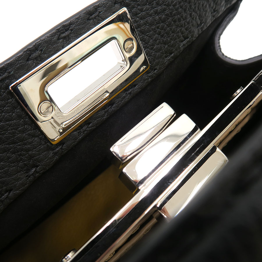 マクロトップステッチ1254目を手作業で施したスモールサイズのアイコニックなフェンディ・ピーカブー ISeeU バッグが入荷しました☆ 1925年以来何世代にもわたりフェンディの職人に受け継がれてきたアイコニックなセレリアの職人技が特徴、天然のグレインが特徴的なブラックのカーフレザーは、メタルフリーのなめし加工が施されています。スエードのライニングをあしらった内側にはブラウンとイエローのツートンカラーのカーフレザー、頑丈なパーティションで区切られた2つのコンパートメントと内ポケットがあり、セレリアロゴプレート、パラジウム仕上げのメタルパーツ仕様となっています。両面にアイコニックなツイストロックの装飾、ハンドルと調節・取り外し可能なショルダーストラップが付いているのでハンドバッグ、ショルダーバッグ、クロスボディバッグとしてお楽しみ頂けますよ♪