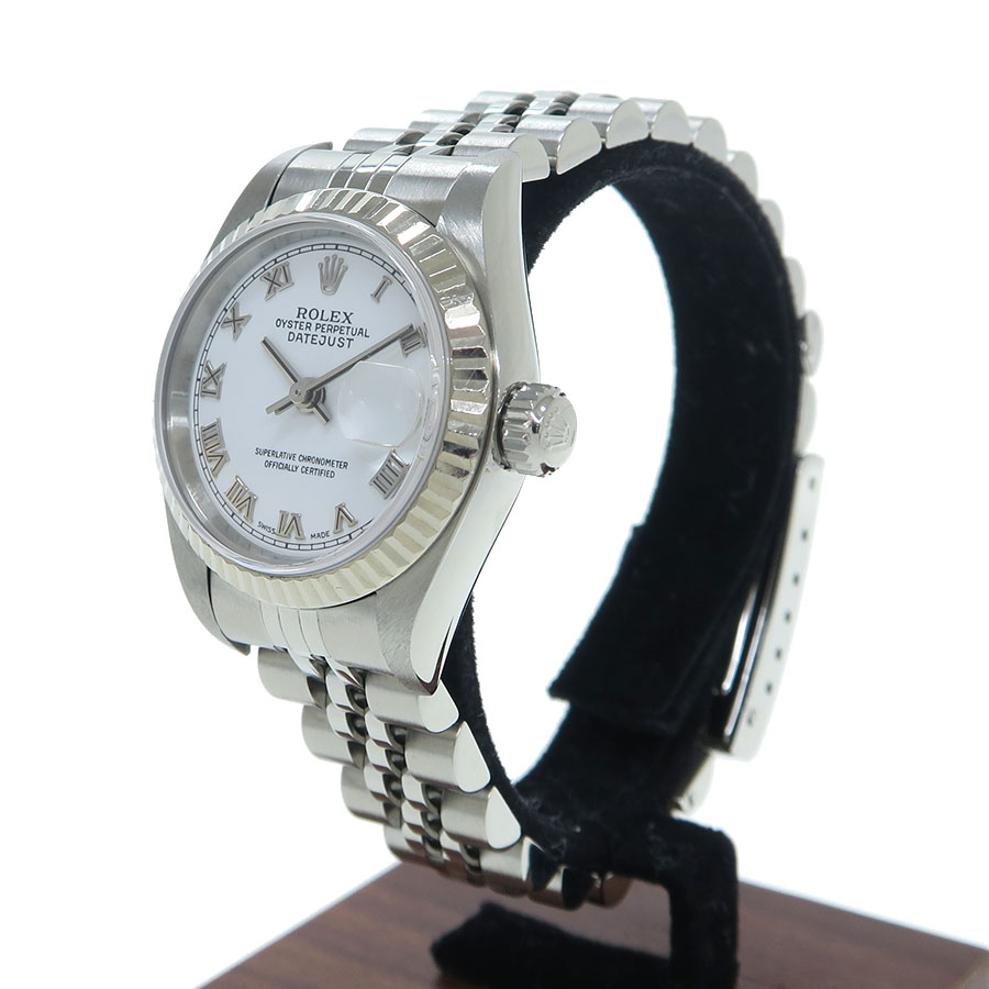Ref.79174 Y番 2002年頃製 レディース・デイトジャスト。ベゼル部分のみホワイトゴールドになります。ホワイトローマンダイアルで視認性もよく人気の組み合わせになります。当社提携の時計修理工房にて内部調整を行っております。ベゼル、裏蓋に小傷はございます。ブレスレットの伸びも若干ございます。