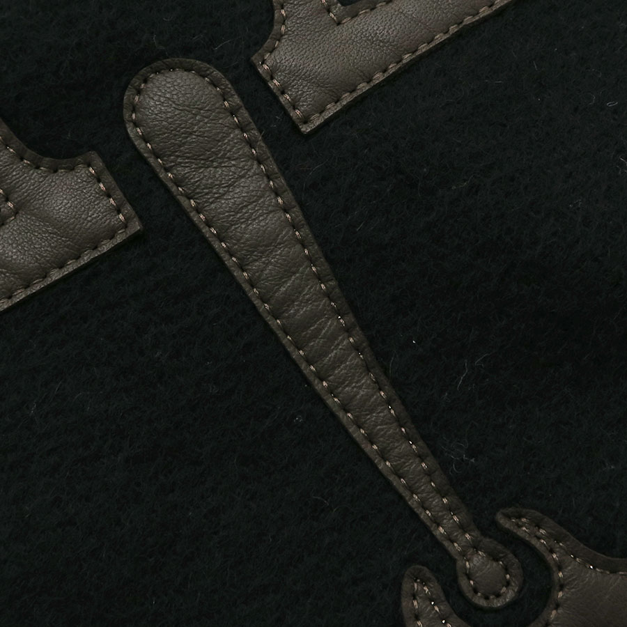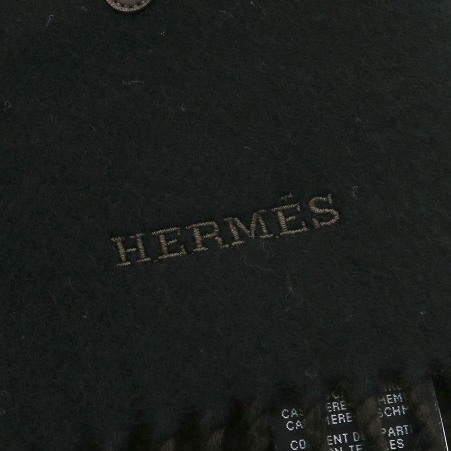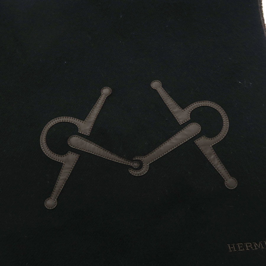 黒のカシミヤ生地にエルメスらしいホースビットのモチーフがレザーパッチであしらわれた、気品溢れるデザイン☆