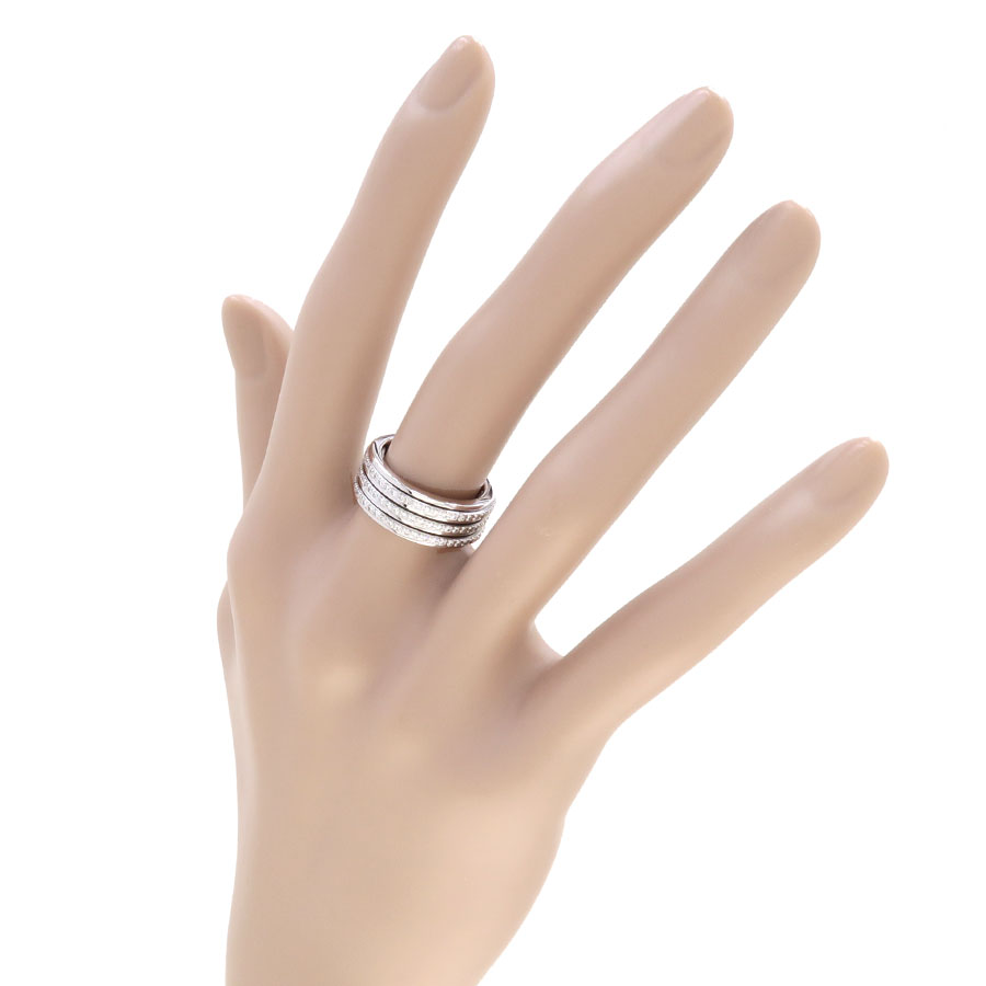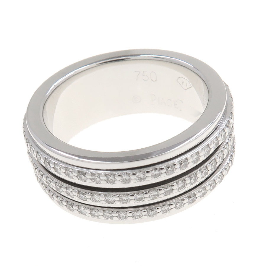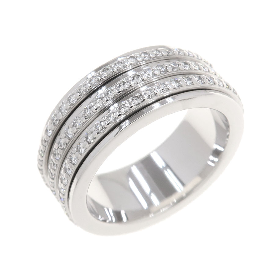 ピアジェの代表的な人気コレクション、ポセションダイヤリングが入荷しました。3列にセットされたダイヤモンドが回転する作りになっており、遊び心のあるデザインですね。 ピアジェで厳選されたダイヤモンドが一周にずらりとセッティングされており、光り輝いている様は上品さと高級感を感じさせる一品です。 ボリュームのある幅に、質の良いダイヤモンドがとても映えますよ。 非常に豪華なリングとなっておりますので、是非お見逃し泣く。
