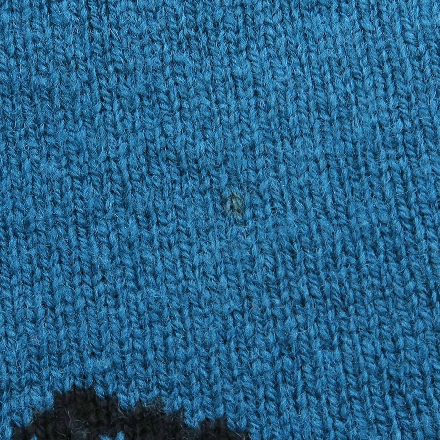 右胸と前裾にシミ汚れ、全体的に収納臭、起毛感や毛玉が多数あり、着用感が見受けられますが通常使用は可能かと思われます。