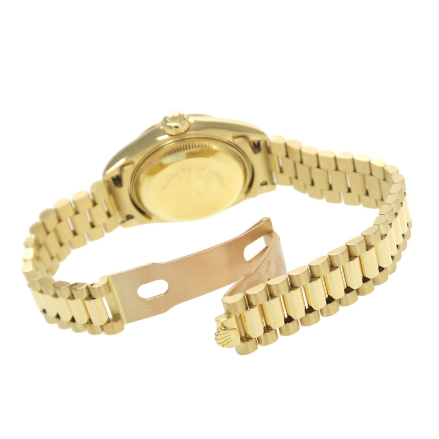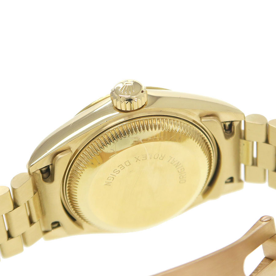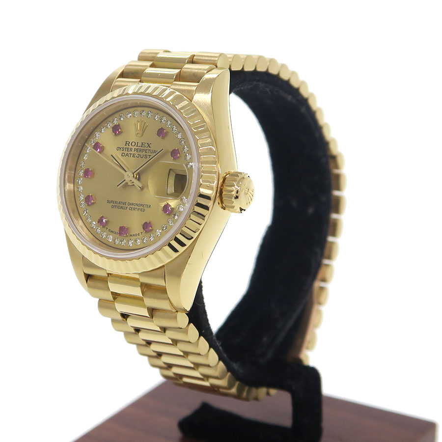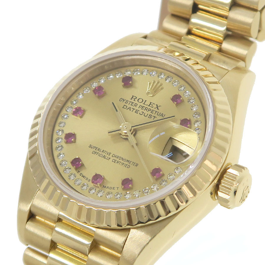 Ref.69178LR 9番台 1986年頃製 ロレックスのレディース・金無垢デイトジャスト。旧型のデイトジャストになり、定番のシャンパンダイアルにダイヤサークルと10ポイントのルビーインデックスの組み合わせなり華やかなモデルです。